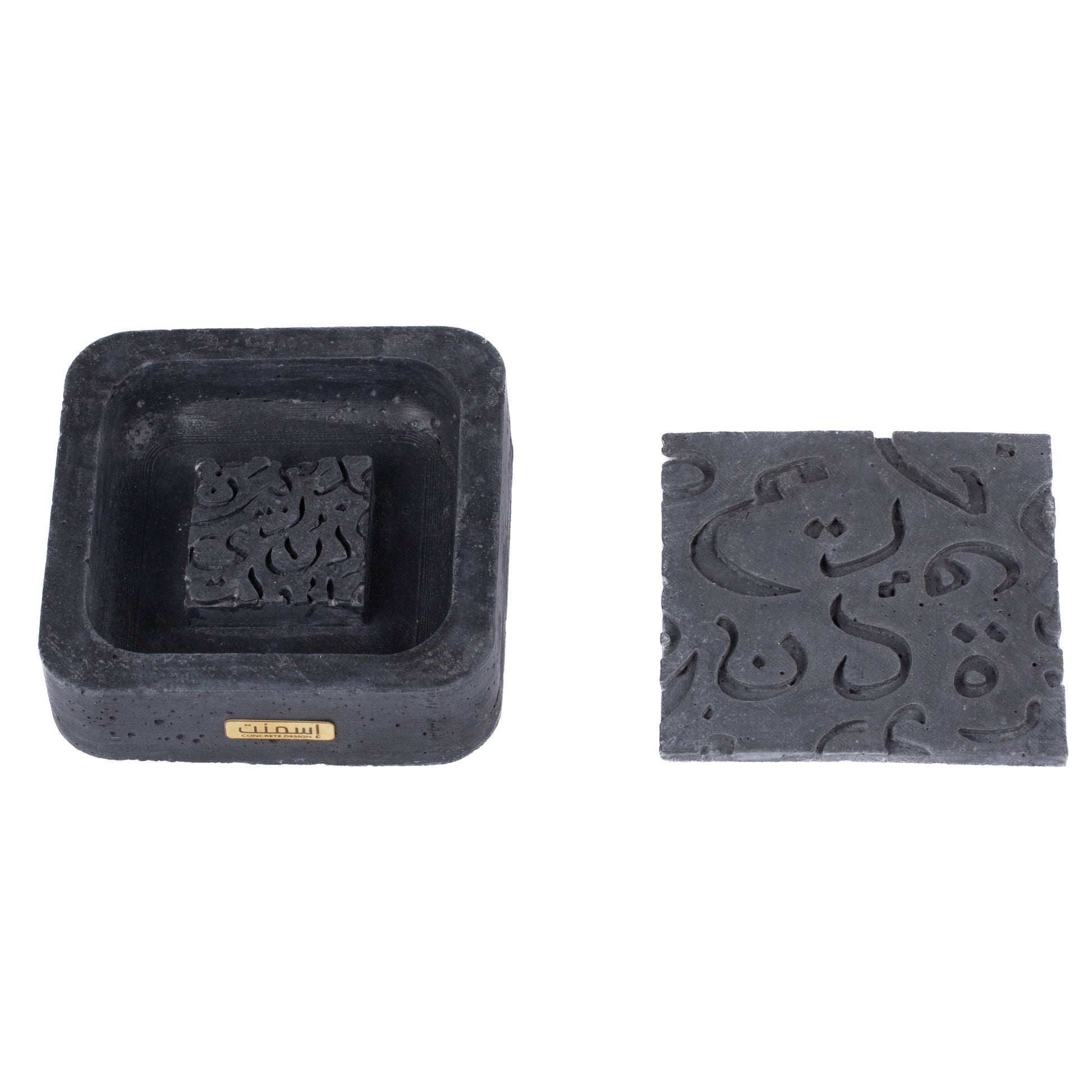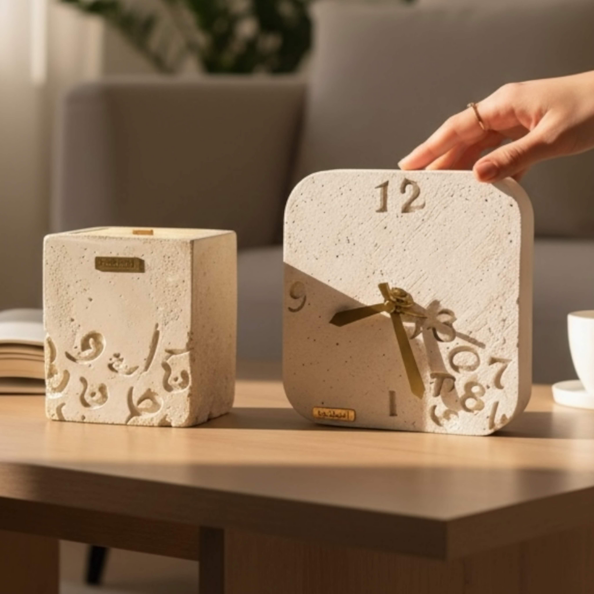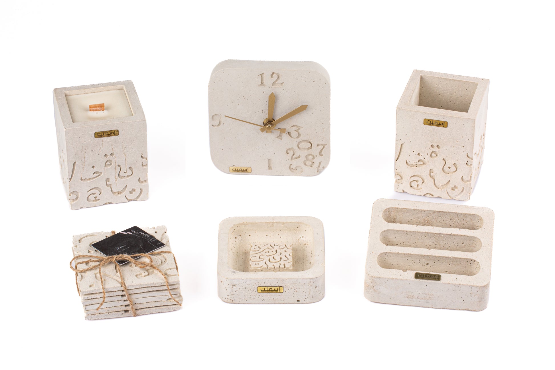 L’art des lettres gravé dans le béton Coffret Huruf ,Inspirée par la beauté de la calligraphie arabe, la collection Huruf réunit six accessoires de bureau en béton minimaliste : porte-stylos, bougie parfumée, 6 sous-verre, porte-mémo, porte-trombones et horloge.