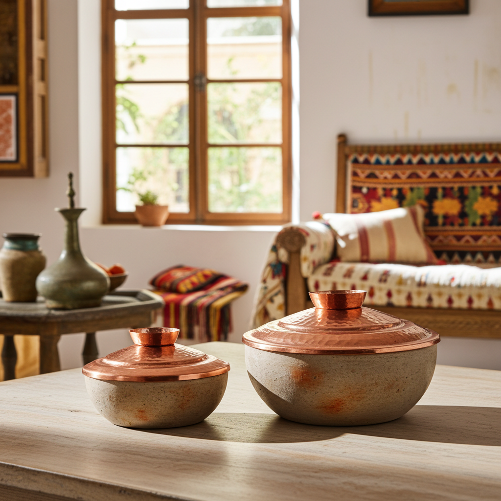 Bol Eclat en béton avec couvercle en cuivre ; Le Bol Éclat en béton avec couvercle en cuivre est une pièce artisanale qui conjugue robustesse et élégance.