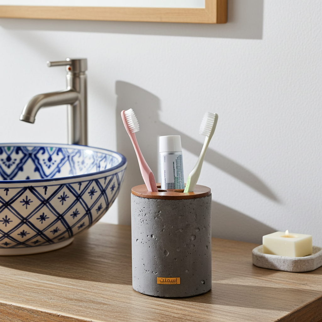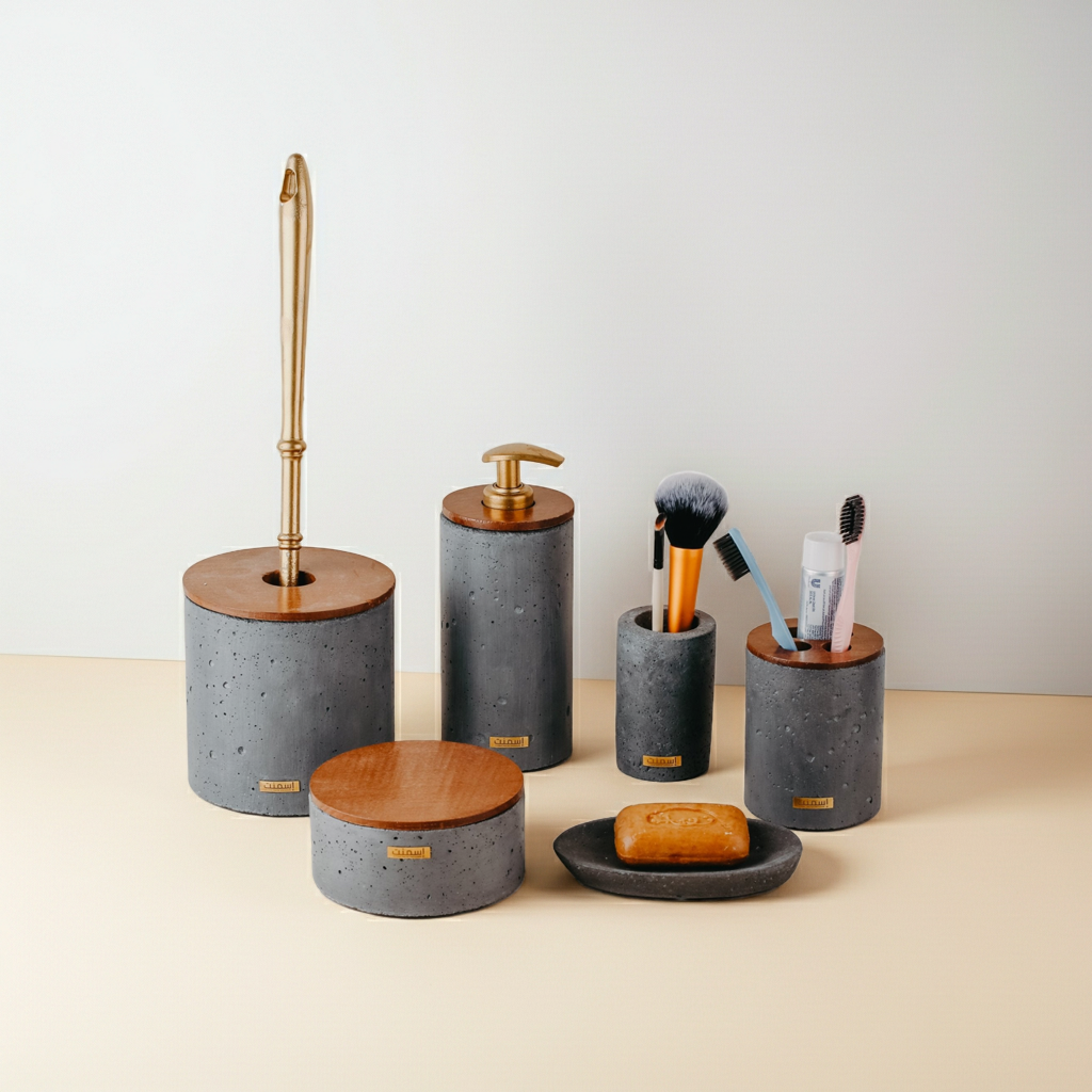 Pack Salle De Bain en béton GFRC ; Apportez une touche de sophistication à votre salle de bain avec le set exclusif de salle de bain : Un distributeur de savon liquide, Un porte-brosse à dents, Un porte-savon, un porte-brosse, une boîte avec couvercle en bois réalisé à la main, en béton haute performance et doté de finitions en bois naturel, ces accessoires allient esthétique et fonctionnalité.
