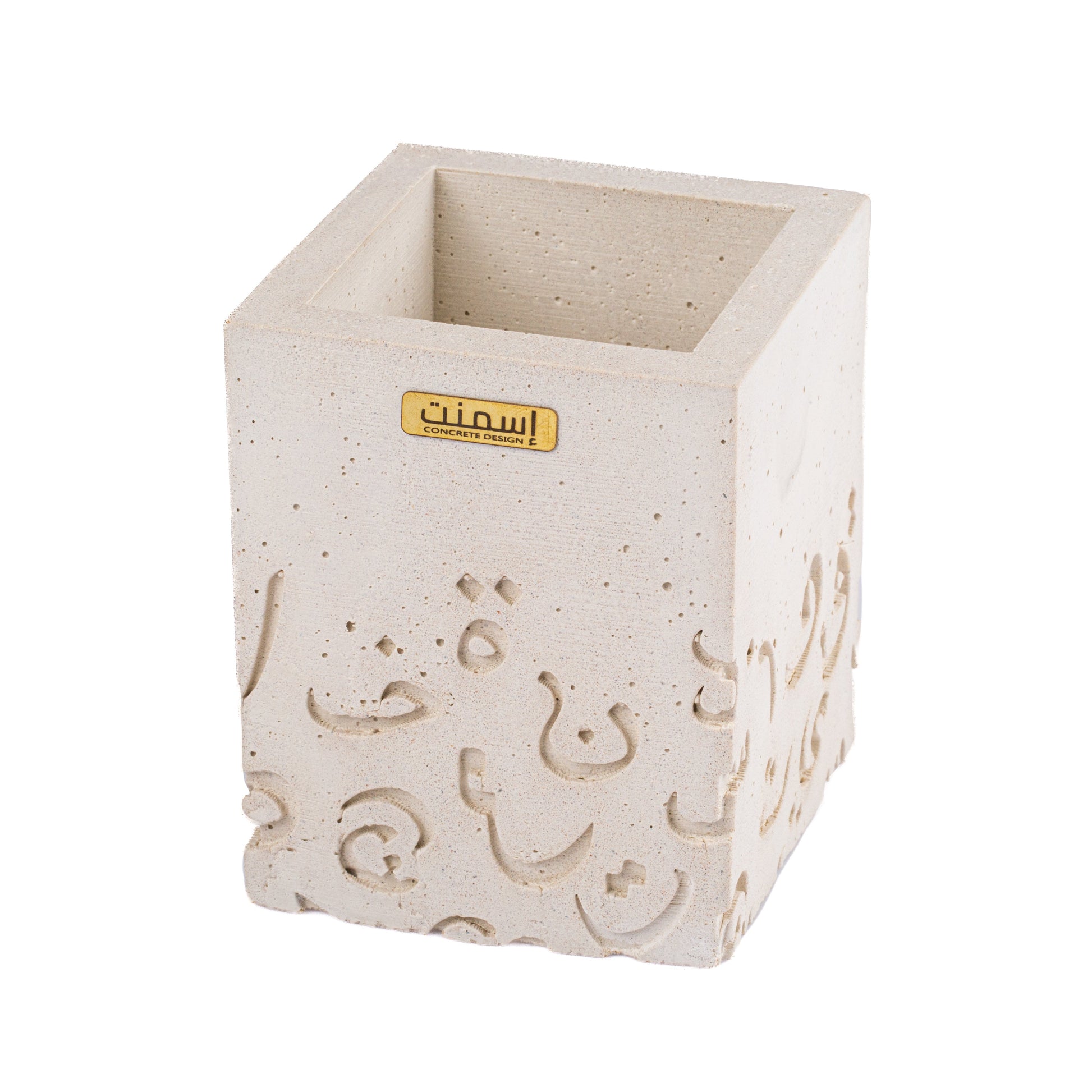 Porte stylos en béton GRFC Huruf ; Un porte-stylos en béton sculpté inspiré des lettres arabes.
