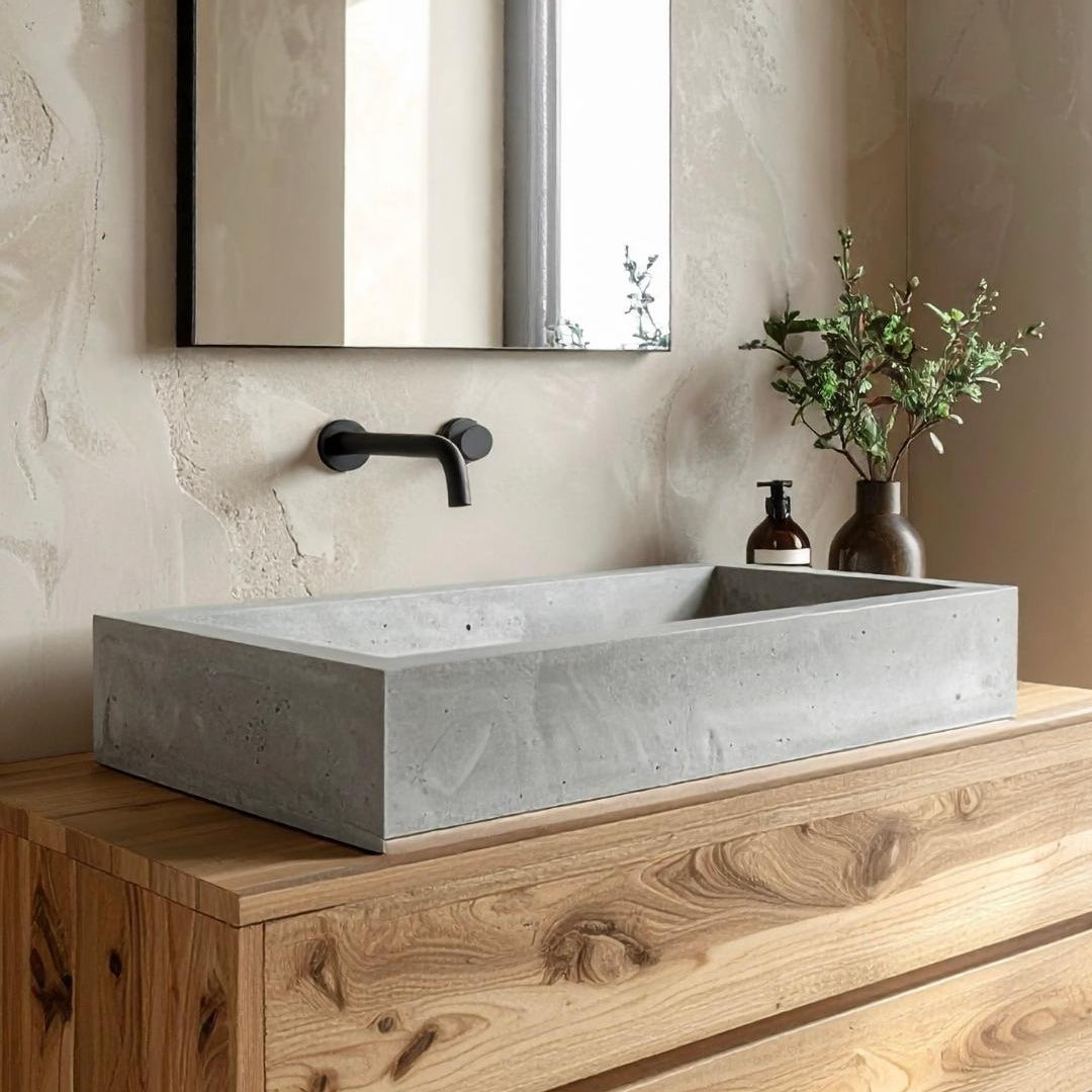 Élégante et minimaliste, cette vasque rectangulaire en béton est protégée par un revêtement hydrofuge qui garantit résistance à l’eau et facilité d’entretien.