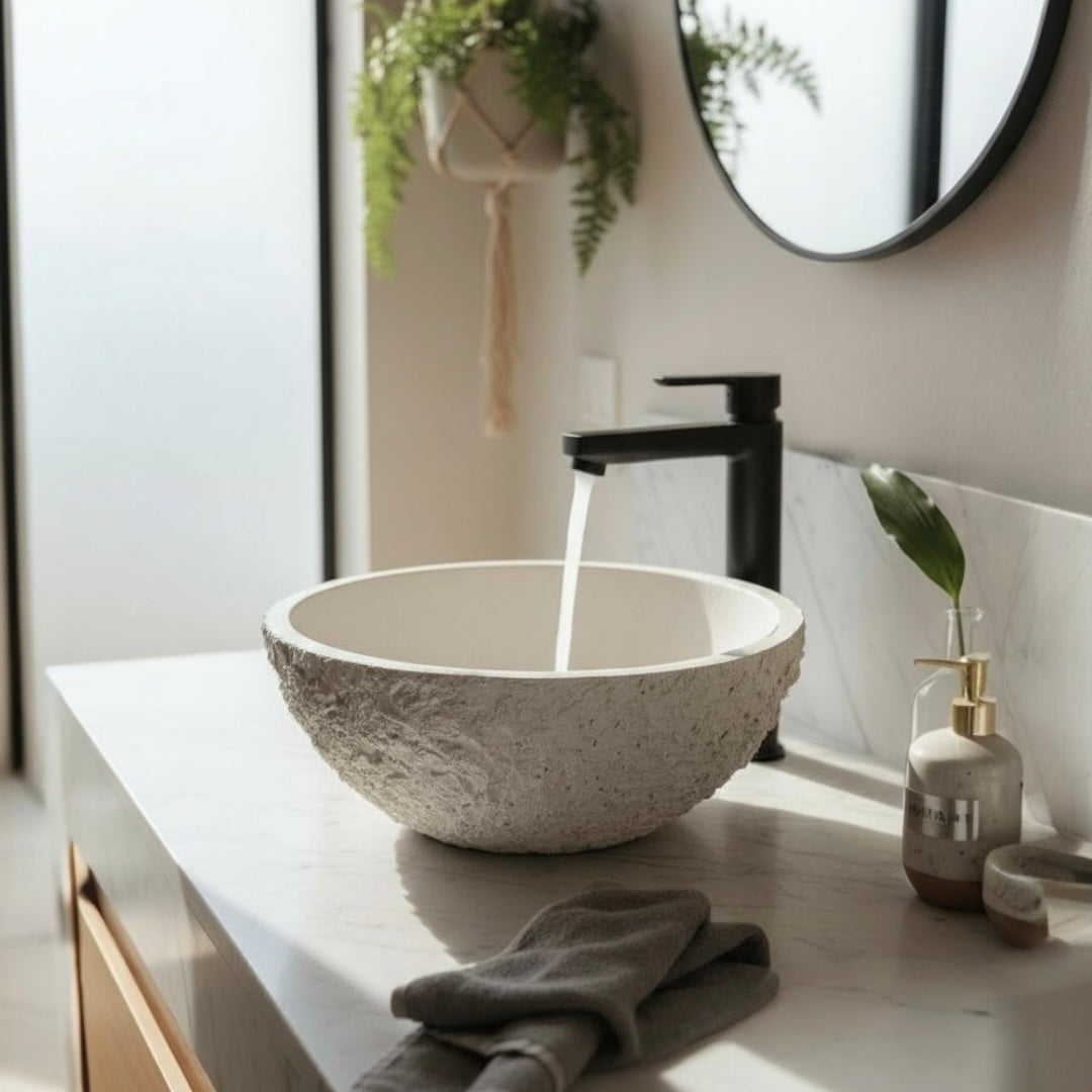 La Vasque Terra d’Ismant Concrete Design incarne l’équilibre parfait entre esthétique naturelle, artisanat moderne et durabilité. Sculptée à la main en béton GFRC, elle se distingue par sa texture brute à l’extérieur et sa surface intérieure lisse, offrant un contraste visuel unique et chaleureux.